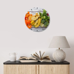- Diese Wanduhr besticht durch ein farbenfrohes Obst- und Gemüsemotiv auf Holzgrund. Perfekt für Küche, Wohnzimmer oder Esszimmer. Das runde Format von 30x30 cm verleiht jedem Raum eine frische Note.