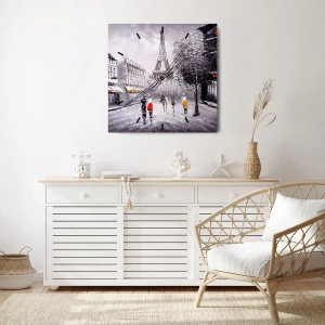 Das Motiv zeigt eine Straße mit dem charakteristischen Eiffelturm im Hintergrund, umgeben von klassischer urbaner Architektur.