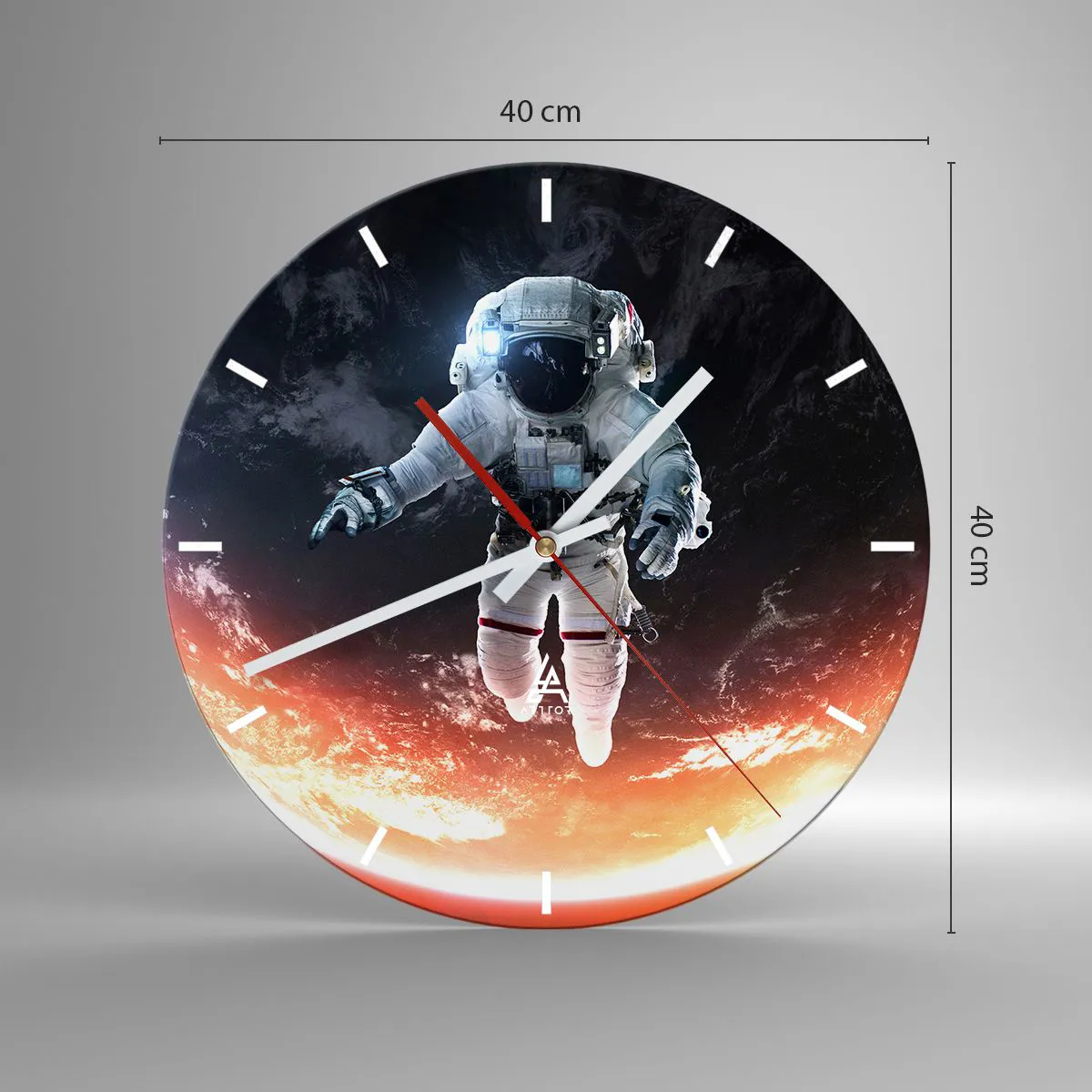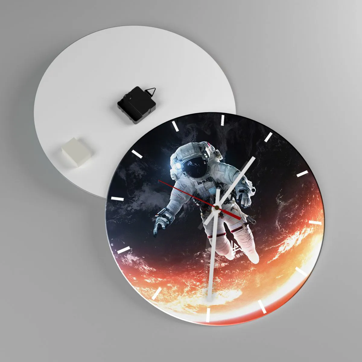 Die Uhr besteht aus 4 mm dickem Sicherheitsglas Glas. Die Herstellungstechnologie der Uhr entspricht der Sicherheitsklasse 2B2 gemäß der Norm PN-EN 12600: 2004, die Stoßfestigkeit garantiert. Die Uhr auf dem Glas ist bereit zu hängen - es hat einen Metallanhänger, einen Anhänger auf der Rückseite der Uhr und einen Schaumstoffabstand, der einen gleichmäßigen Abstand zwischen der Uhr und der Wand reguliert. Die Uhr hat einen geräuschlosen Schwimmmechanismus, der von einer 1,5-V-Batterie betrieben wird - AA-Batterie inbegriffen).
