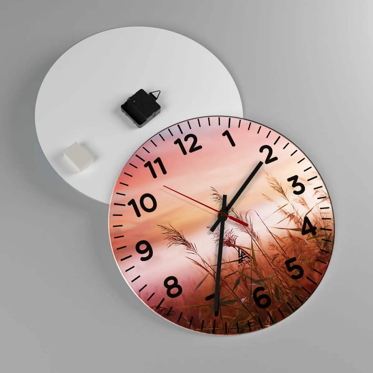 Die Uhr besteht aus 4 mm dickem Sicherheitsglas Glas. Die Herstellungstechnologie der Uhr entspricht der Sicherheitsklasse 2B2 gemäß der Norm PN-EN 12600: 2004, die Stoßfestigkeit garantiert. Die Uhr auf dem Glas ist bereit zu hängen - es hat einen Metallanhänger, einen Anhänger auf der Rückseite der Uhr und einen Schaumstoffabstand, der einen gleichmäßigen Abstand zwischen der Uhr und der Wand reguliert. Die Uhr hat einen geräuschlosen Schwimmmechanismus, der von einer 1,5-V-Batterie betrieben wird - AA-Batterie inbegriffen).