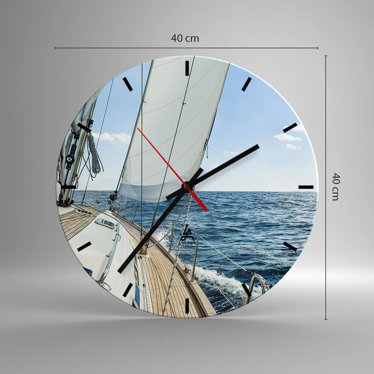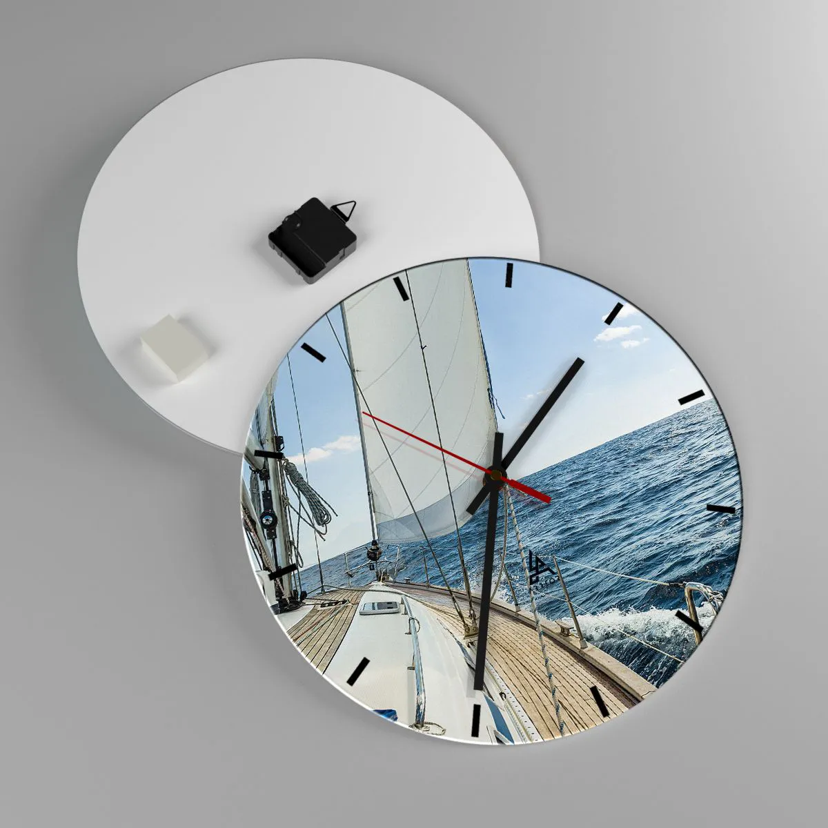 Die Uhr besteht aus 4 mm dickem Sicherheitsglas Glas. Die Herstellungstechnologie der Uhr entspricht der Sicherheitsklasse 2B2 gemäß der Norm PN-EN 12600: 2004, die Stoßfestigkeit garantiert. Die Uhr auf dem Glas ist bereit zu hängen - es hat einen Metallanhänger, einen Anhänger auf der Rückseite der Uhr und einen Schaumstoffabstand, der einen gleichmäßigen Abstand zwischen der Uhr und der Wand reguliert. Die Uhr hat einen geräuschlosen Schwimmmechanismus, der von einer 1,5-V-Batterie betrieben wird - AA-Batterie inbegriffen).