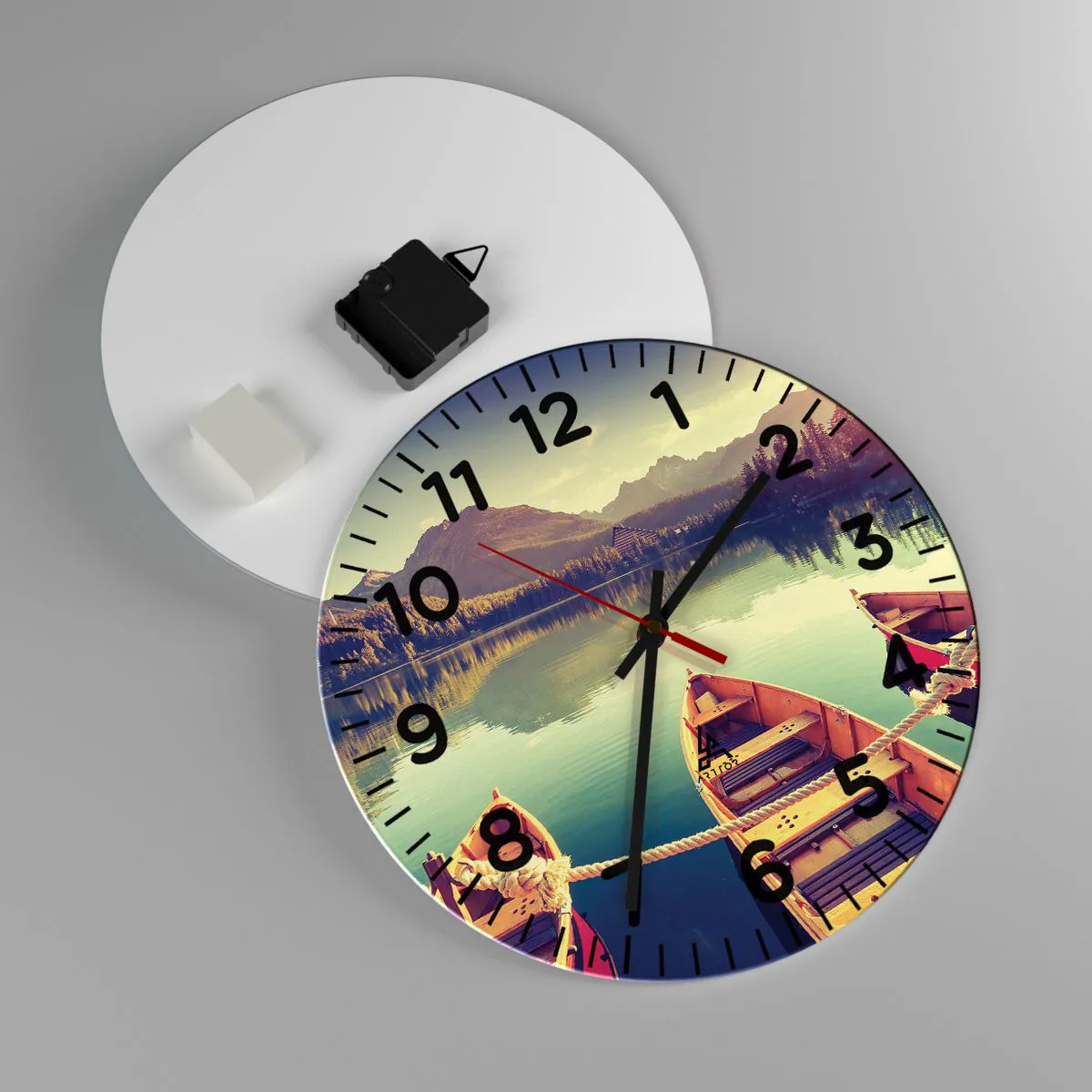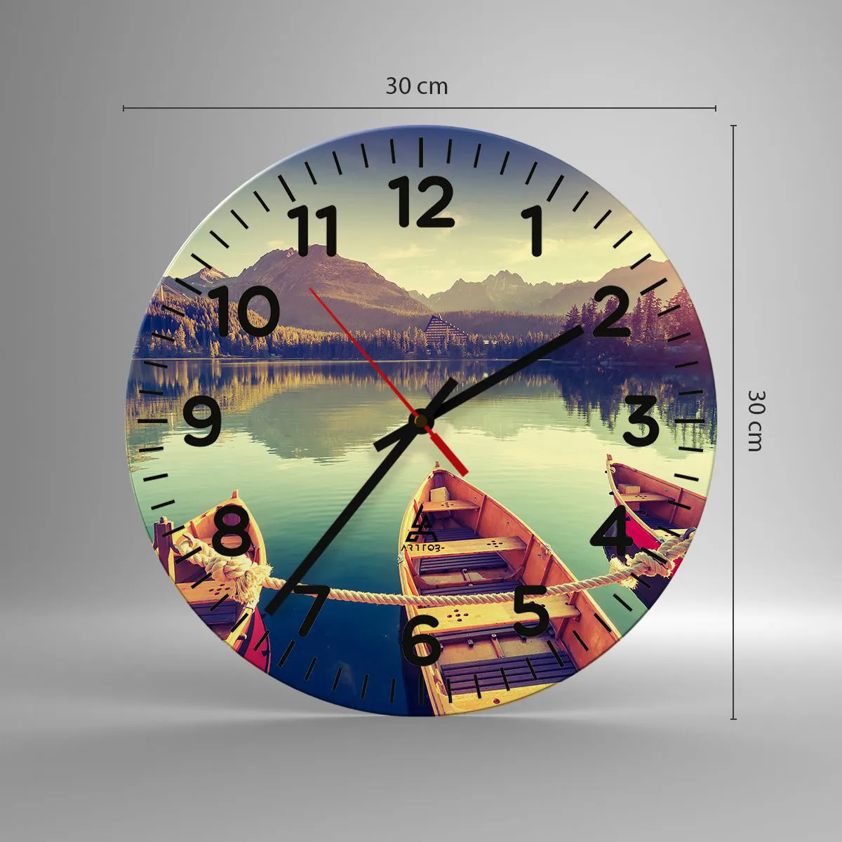 Die Uhr besteht aus 4 mm dickem Sicherheitsglas Glas. Die Herstellungstechnologie der Uhr entspricht der Sicherheitsklasse 2B2 gemäß der Norm PN-EN 12600: 2004, die Stoßfestigkeit garantiert. Die Uhr auf dem Glas ist bereit zu hängen - es hat einen Metallanhänger, einen Anhänger auf der Rückseite der Uhr und einen Schaumstoffabstand, der einen gleichmäßigen Abstand zwischen der Uhr und der Wand reguliert. Die Uhr hat einen geräuschlosen Schwimmmechanismus, der von einer 1,5-V-Batterie betrieben wird - AA-Batterie inbegriffen).