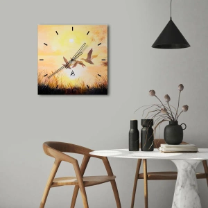 - Eine Wanduhr mit dem Motiv fliegender Enten vor dem Hintergrund der untergehenden Sonne und Gras, perfekt für Innenräume, die von Natur und Harmonie inspiriert sind.