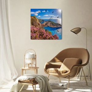 Wanduhr - Glasuhr - Blick auf die Klippe, das blaue Meer und blühende Büsche an einem sonnigen Tag - 30x30cm - Mein toller Griechenlandurlaub - Moderne Wanddekoration für Wohnzimmer, Küche und Schlafzimmer ARTTOR