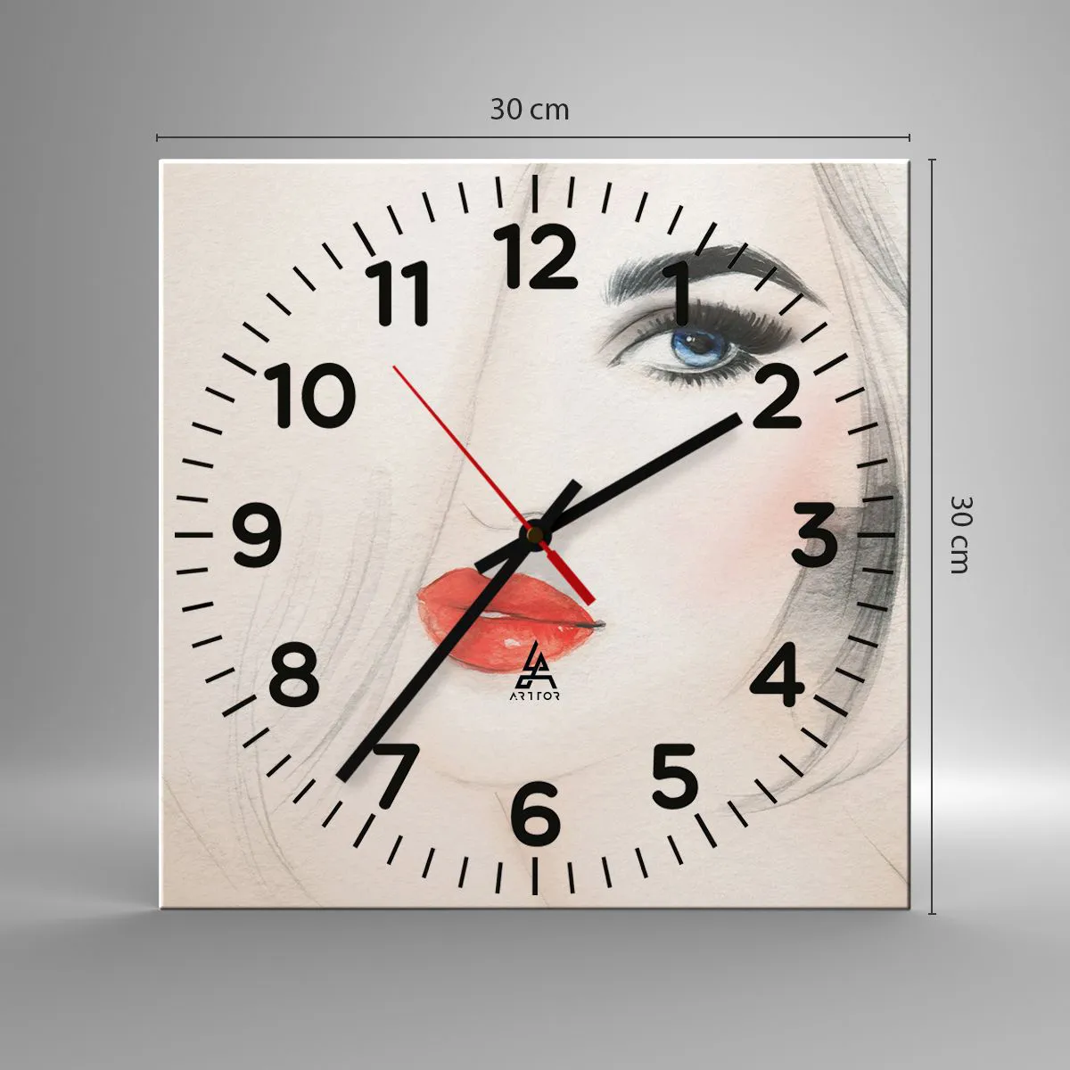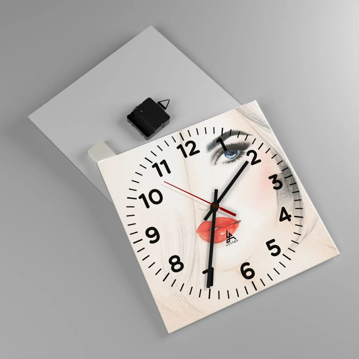 Die Uhr besteht aus 4 mm dickem Sicherheitsglas Glas. Die Herstellungstechnologie der Uhr entspricht der Sicherheitsklasse 2B2 gemäß der Norm PN-EN 12600: 2004, die Stoßfestigkeit garantiert. Die Uhr auf dem Glas ist bereit zu hängen - es hat einen Metallanhänger, einen Anhänger auf der Rückseite der Uhr und einen Schaumstoffabstand, der einen gleichmäßigen Abstand zwischen der Uhr und der Wand reguliert. Die Uhr hat einen geräuschlosen Schwimmmechanismus, der von einer 1,5-V-Batterie betrieben wird - AA-Batterie inbegriffen).