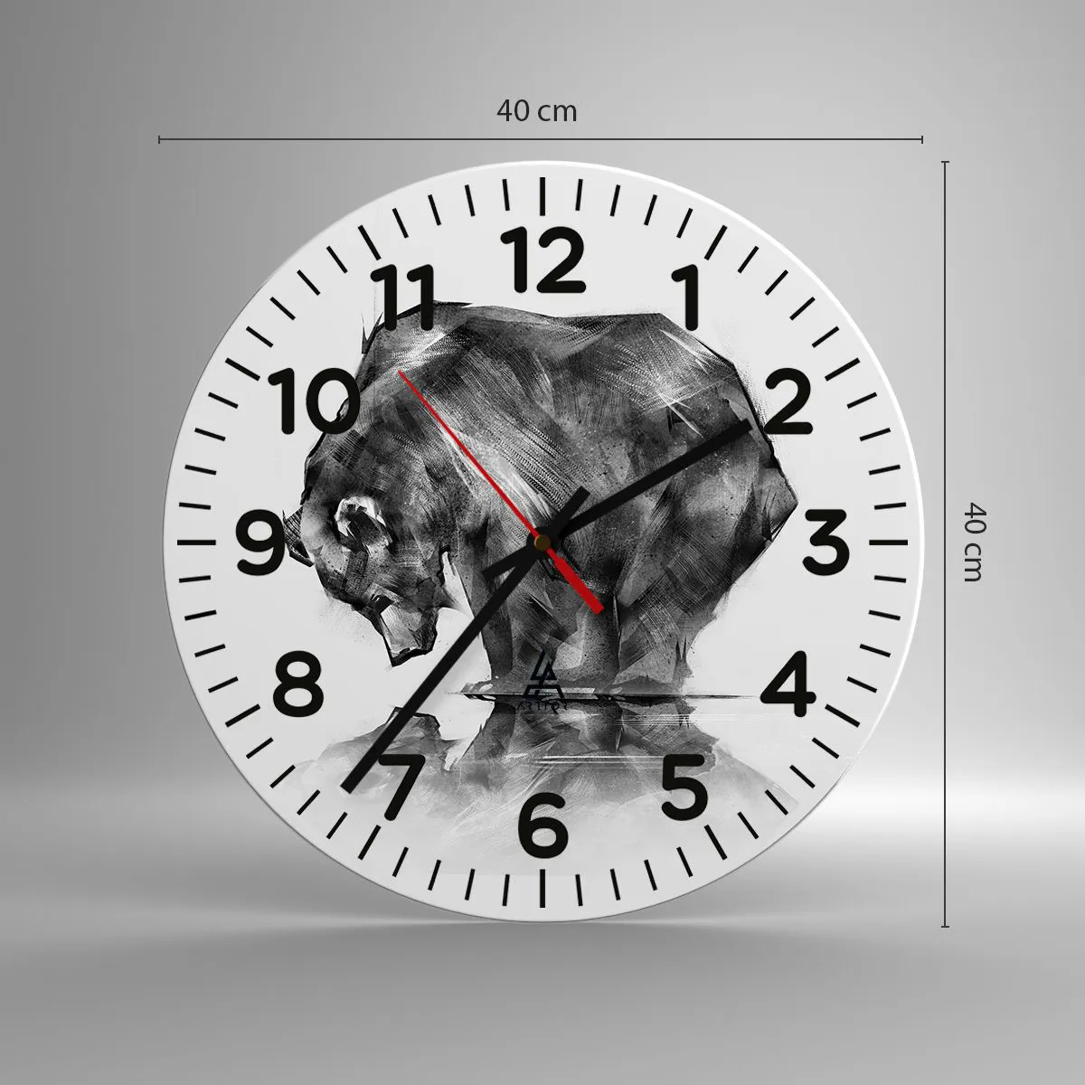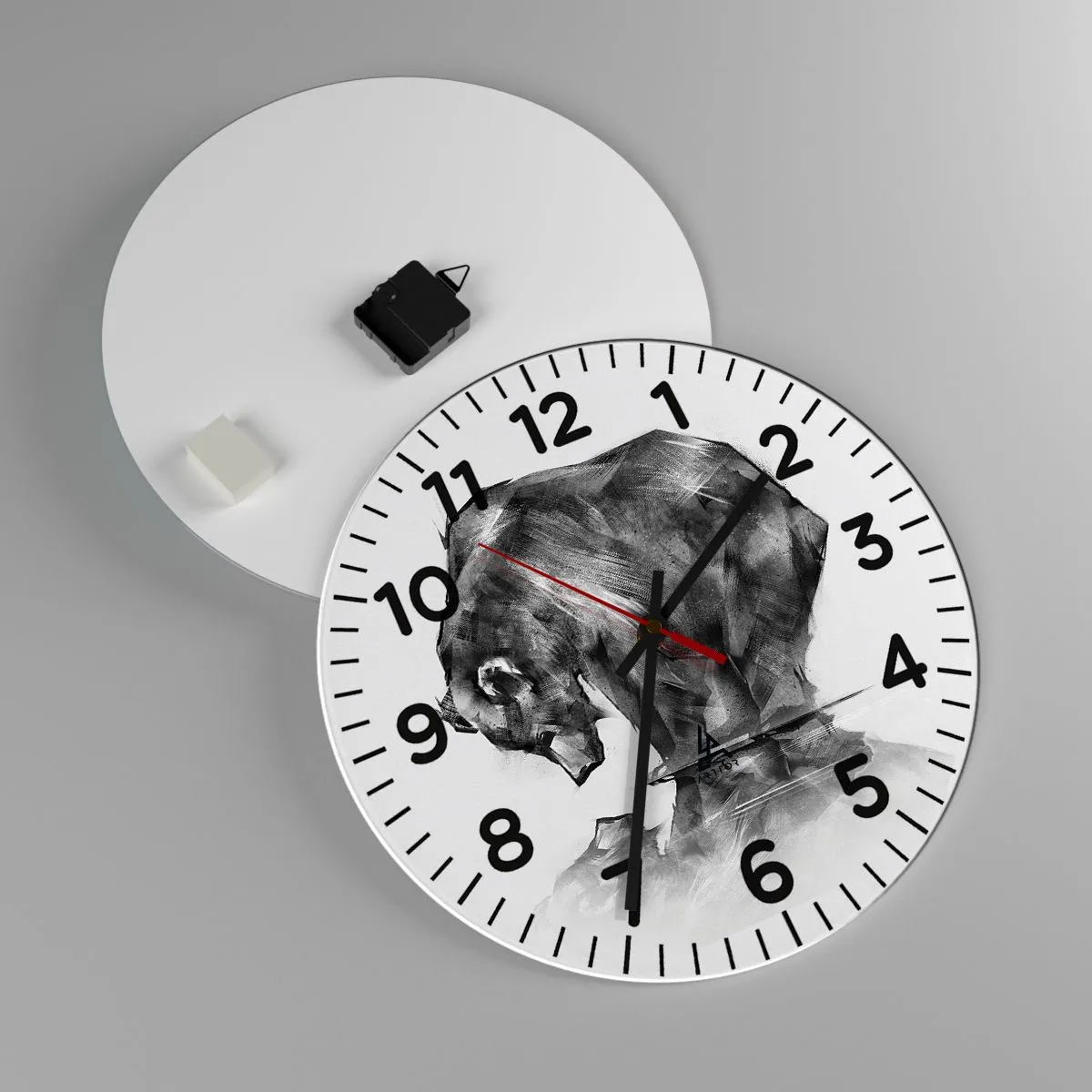 Die Uhr besteht aus 4 mm dickem Sicherheitsglas Glas. Die Herstellungstechnologie der Uhr entspricht der Sicherheitsklasse 2B2 gemäß der Norm PN-EN 12600: 2004, die Stoßfestigkeit garantiert. Die Uhr auf dem Glas ist bereit zu hängen - es hat einen Metallanhänger, einen Anhänger auf der Rückseite der Uhr und einen Schaumstoffabstand, der einen gleichmäßigen Abstand zwischen der Uhr und der Wand reguliert. Die Uhr hat einen geräuschlosen Schwimmmechanismus, der von einer 1,5-V-Batterie betrieben wird - AA-Batterie inbegriffen).