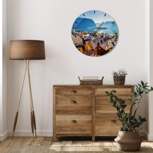 - Diese Wanduhr mit 30 cm Durchmesser zeigt eine malerische Bergstadt am See. Perfekt für Liebhaber von Landschaft und Ruhe.