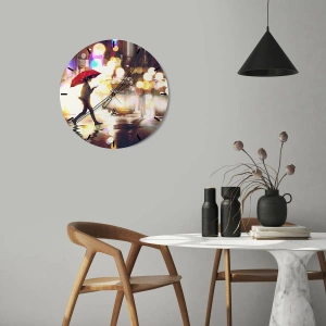 - Diese runde Wanduhr im Format 30 x 30 cm zeigt das Motiv einer Figur mit rotem Regenschirm vor dem Hintergrund der Lichter einer nächtlichen Stadt. Perfekt für moderne und stimmungsvolle Innenräume.