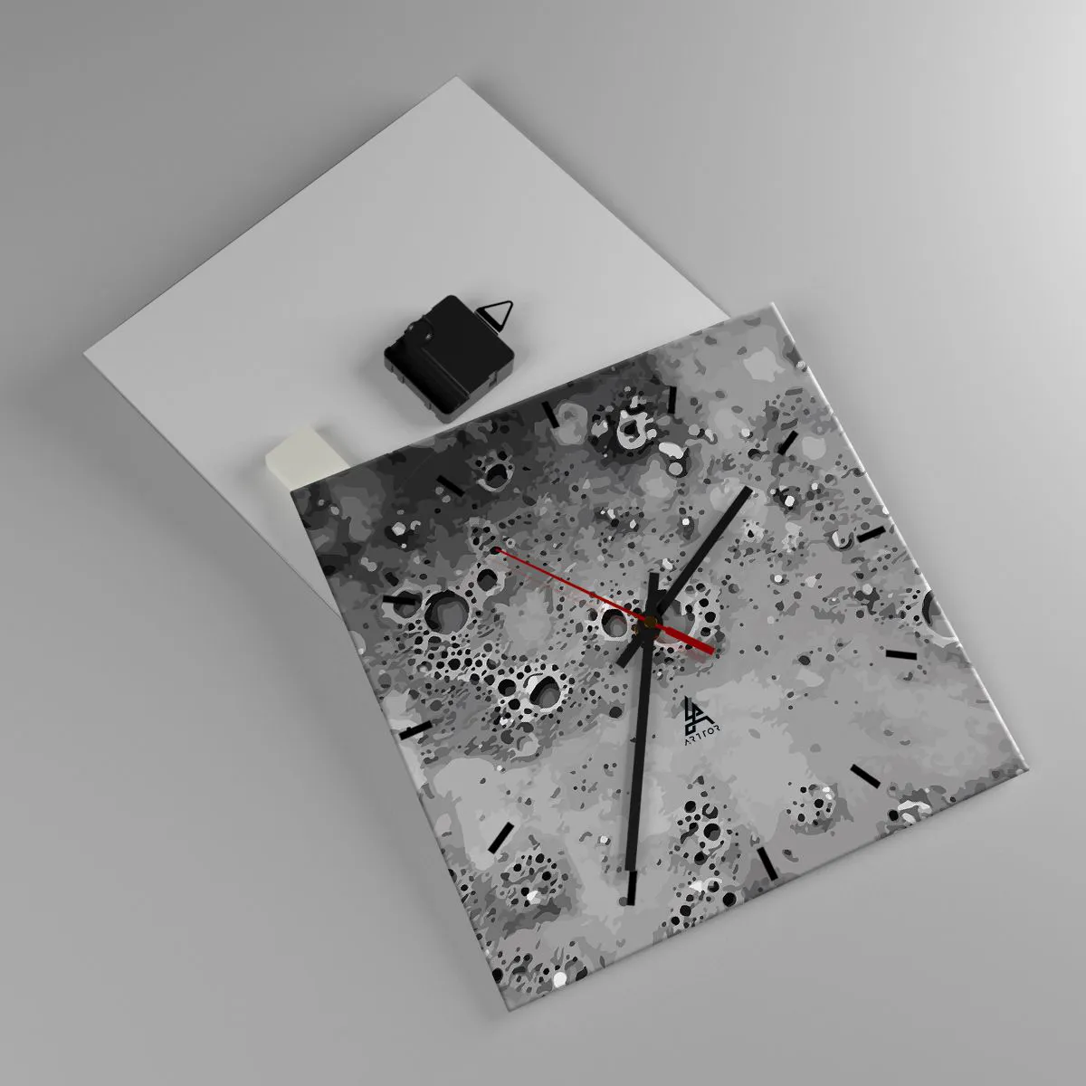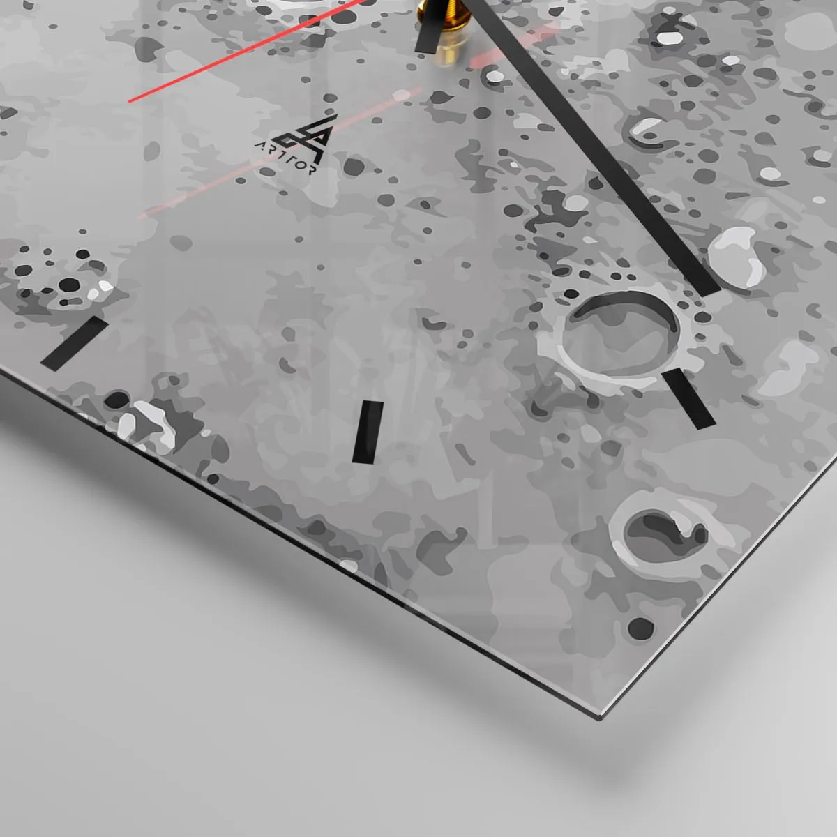 Die Uhr besteht aus 4 mm dickem Sicherheitsglas Glas. Die Herstellungstechnologie der Uhr entspricht der Sicherheitsklasse 2B2 gemäß der Norm PN-EN 12600: 2004, die Stoßfestigkeit garantiert. Die Uhr auf dem Glas ist bereit zu hängen - es hat einen Metallanhänger, einen Anhänger auf der Rückseite der Uhr und einen Schaumstoffabstand, der einen gleichmäßigen Abstand zwischen der Uhr und der Wand reguliert. Die Uhr hat einen geräuschlosen Schwimmmechanismus, der von einer 1,5-V-Batterie betrieben wird - AA-Batterie inbegriffen).