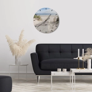 Die Uhr besteht aus 4 mm dickem Sicherheitsglas Glas. Die Herstellungstechnologie der Uhr entspricht der Sicherheitsklasse 2B2 gemäß der Norm PN-EN 12600: 2004, die Stoßfestigkeit garantiert. Die Uhr auf dem Glas ist bereit zu hängen - es hat einen Metallanhänger, einen Anhänger auf der Rückseite der Uhr und einen Schaumstoffabstand, der einen gleichmäßigen Abstand zwischen der Uhr und der Wand reguliert. Die Uhr hat einen geräuschlosen Schwimmmechanismus, der von einer 1,5-V-Batterie betrieben wird - AA-Batterie inbegriffen).
