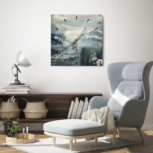 Die Uhr besteht aus 4 mm dickem Sicherheitsglas Glas. Die Herstellungstechnologie der Uhr entspricht der Sicherheitsklasse 2B2 gemäß der Norm PN-EN 12600: 2004, die Stoßfestigkeit garantiert. Die Uhr auf dem Glas ist bereit zu hängen - es hat einen Metallanhänger, einen Anhänger auf der Rückseite der Uhr und einen Schaumstoffabstand, der einen gleichmäßigen Abstand zwischen der Uhr und der Wand reguliert. Die Uhr hat einen geräuschlosen Schwimmmechanismus, der von einer 1,5-V-Batterie betrieben wird - AA-Batterie inbegriffen).