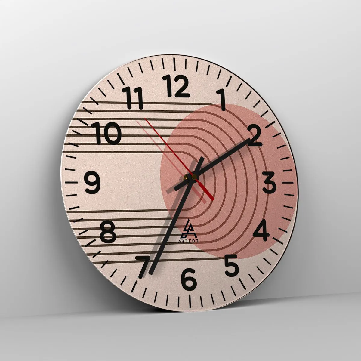 Die Uhr auf Glas ist fertig zum Aufhängen an der Wand, sie ist mit einem vormontierten Metallaufhänger für eine einfache Installation ausgestattet.