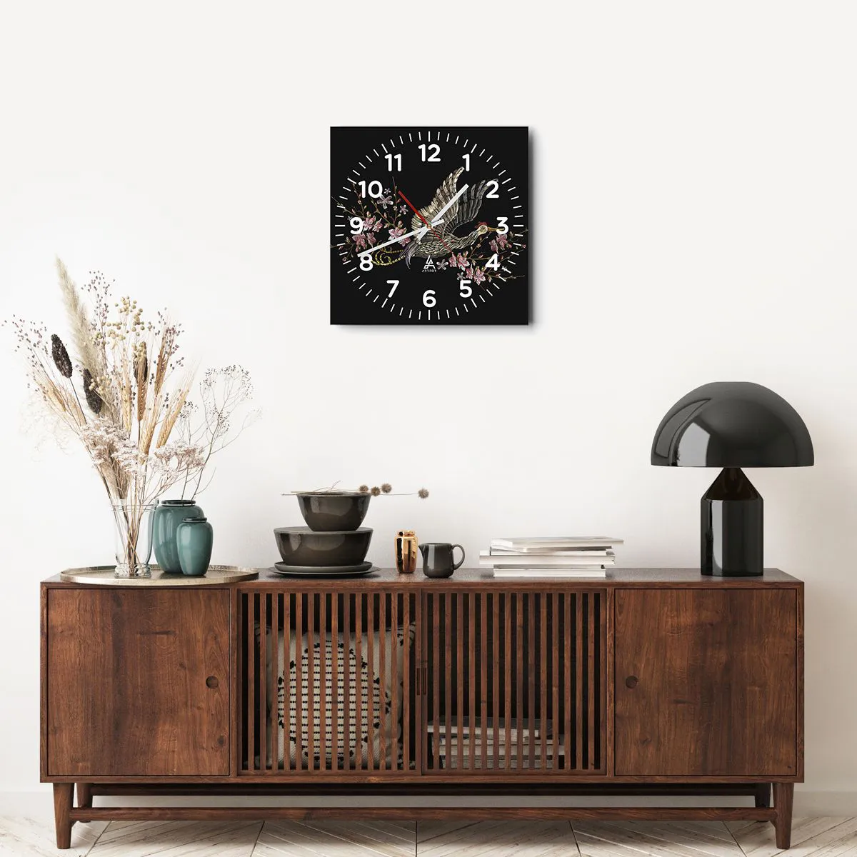 Wanduhr - Glasuhr - Exotischer gestickter Vogel - 40x40 cm