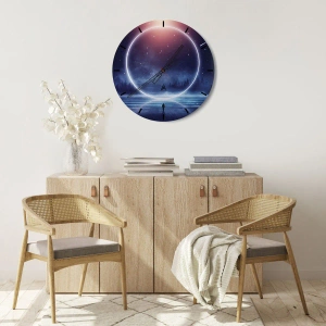 Die Uhr besteht aus 4 mm dickem Sicherheitsglas Glas. Die Herstellungstechnologie der Uhr entspricht der Sicherheitsklasse 2B2 gemäß der Norm PN-EN 12600: 2004, die Stoßfestigkeit garantiert. Die Uhr auf dem Glas ist bereit zu hängen - es hat einen Metallanhänger, einen Anhänger auf der Rückseite der Uhr und einen Schaumstoffabstand, der einen gleichmäßigen Abstand zwischen der Uhr und der Wand reguliert. Die Uhr hat einen geräuschlosen Schwimmmechanismus, der von einer 1,5-V-Batterie betrieben wird - AA-Batterie inbegriffen).