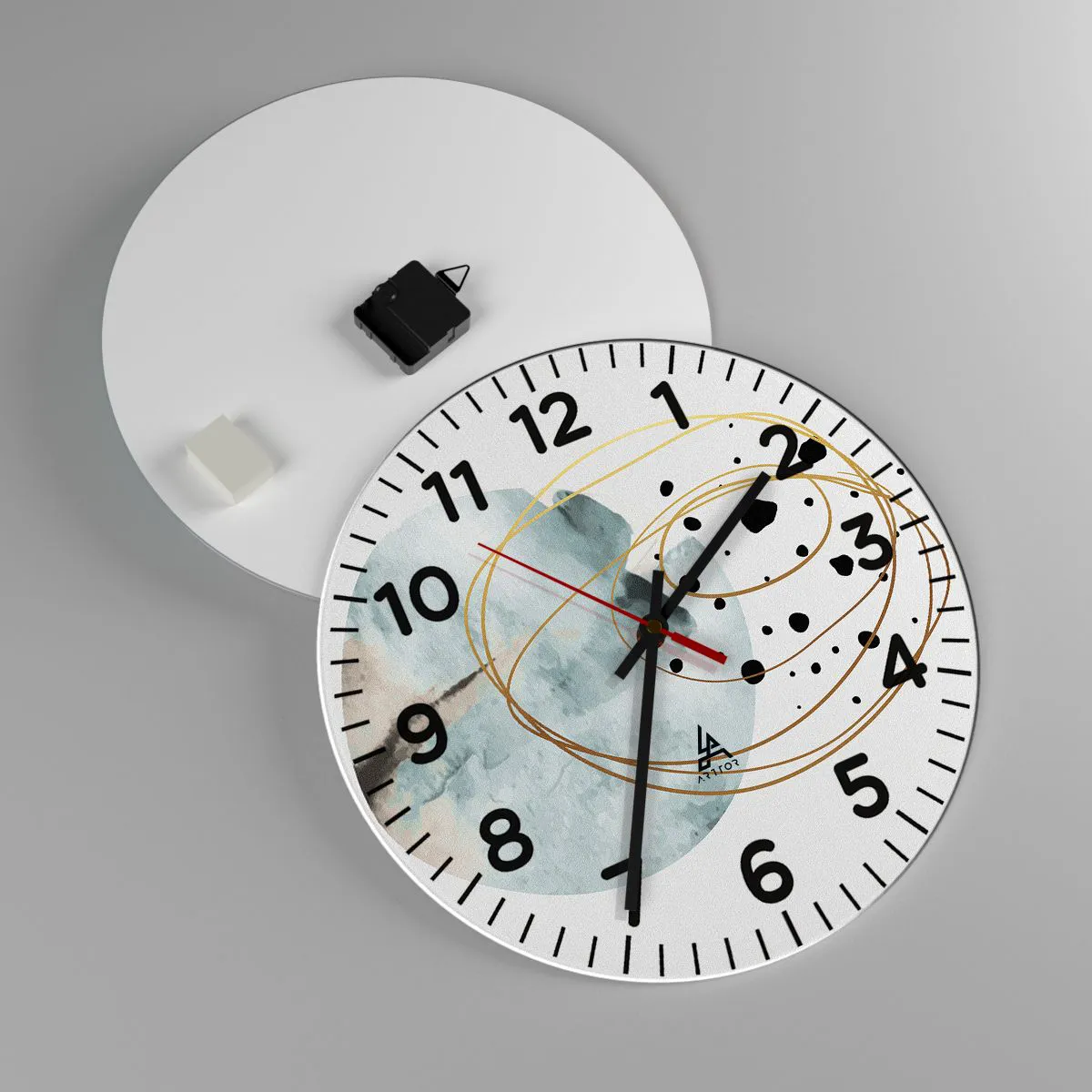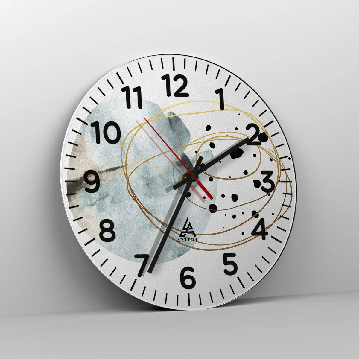 Die Uhr besteht aus 4 mm dickem Sicherheitsglas Glas. Die Herstellungstechnologie der Uhr entspricht der Sicherheitsklasse 2B2 gemäß der Norm PN-EN 12600: 2004, die Stoßfestigkeit garantiert. Die Uhr auf dem Glas ist bereit zu hängen - es hat einen Metallanhänger, einen Anhänger auf der Rückseite der Uhr und einen Schaumstoffabstand, der einen gleichmäßigen Abstand zwischen der Uhr und der Wand reguliert. Die Uhr hat einen geräuschlosen Schwimmmechanismus, der von einer 1,5-V-Batterie betrieben wird - AA-Batterie inbegriffen).