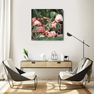 • Schwarm Flamingos, Vogel, Natur, Botanik, Natur, Tiere, Für das Büro, für das Arbeitszimmer, für das Esszimmer, für den Flur, für das Wohnzimmer, für das Schlafzimmer, Orange, Rosa, Grün, Quadrat