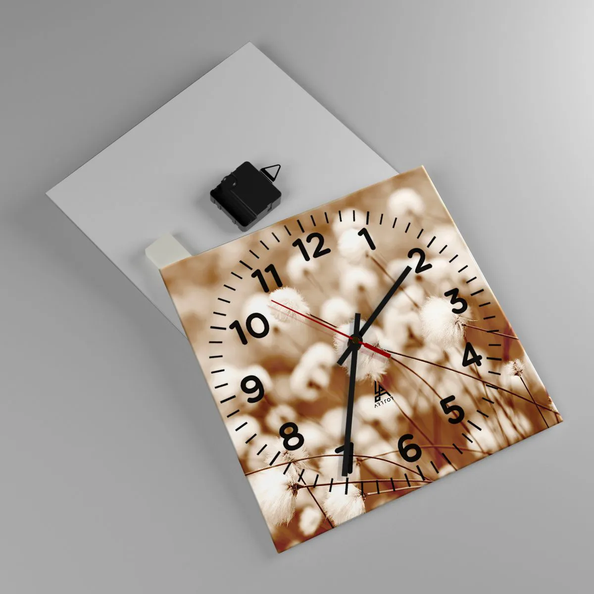 Die Uhr besteht aus 4 mm dickem Sicherheitsglas Glas. Die Herstellungstechnologie der Uhr entspricht der Sicherheitsklasse 2B2 gemäß der Norm PN-EN 12600: 2004, die Stoßfestigkeit garantiert. Die Uhr auf dem Glas ist bereit zu hängen - es hat einen Metallanhänger, einen Anhänger auf der Rückseite der Uhr und einen Schaumstoffabstand, der einen gleichmäßigen Abstand zwischen der Uhr und der Wand reguliert. Die Uhr hat einen geräuschlosen Schwimmmechanismus, der von einer 1,5-V-Batterie betrieben wird - AA-Batterie inbegriffen).