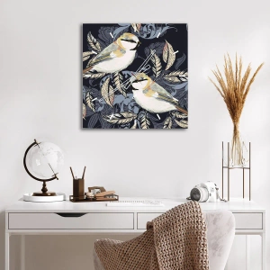 Wanduhr - Glasuhr - Illustration von zwei Vögeln vor einem Hintergrund aus dekorativen Blättern - 30x30cm - Gelb-blauer Triller - Moderne Wanddekoration für Wohnzimmer, Küche und Schlafzimmer ARTTOR