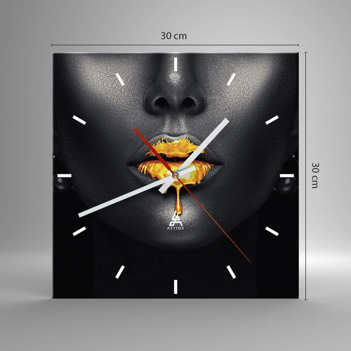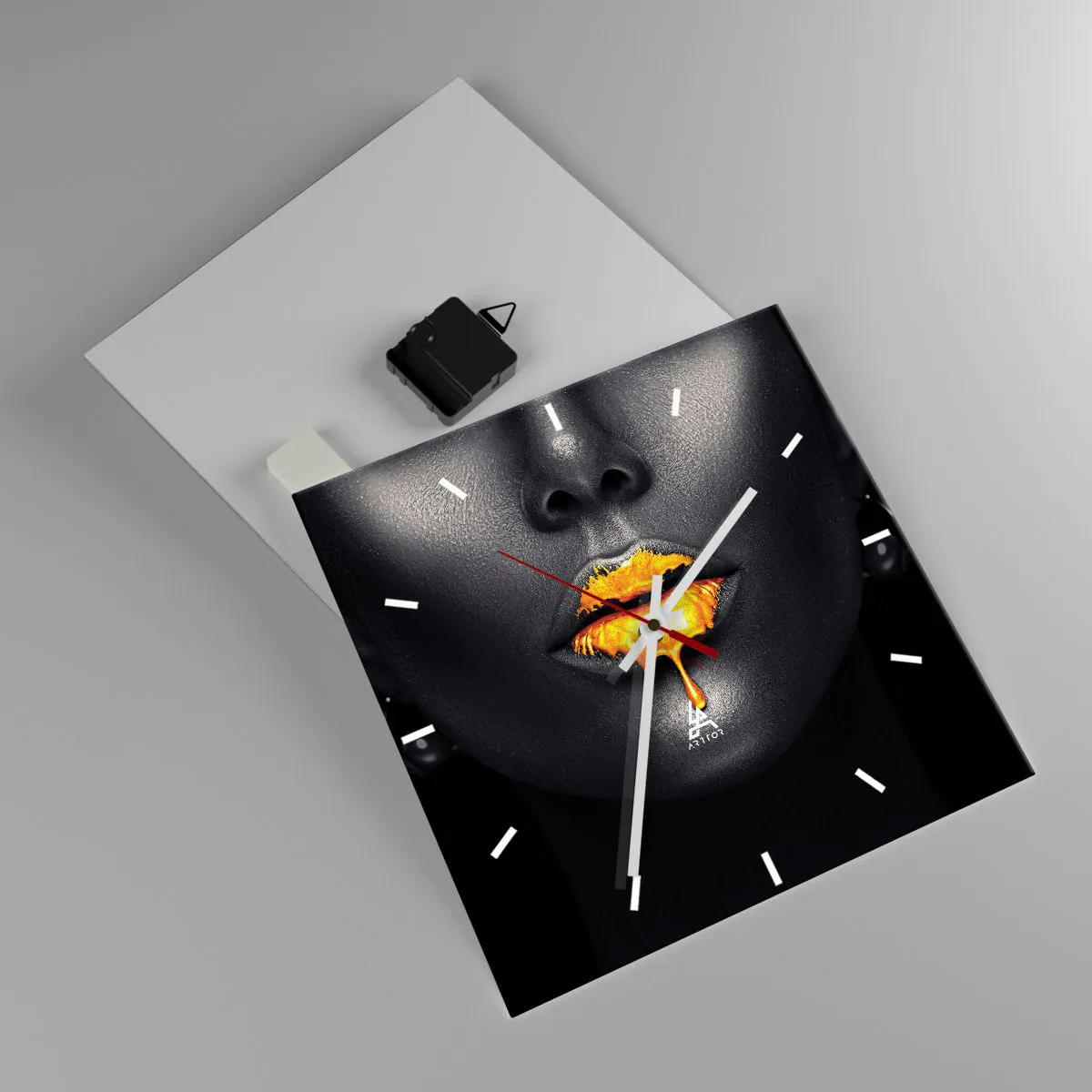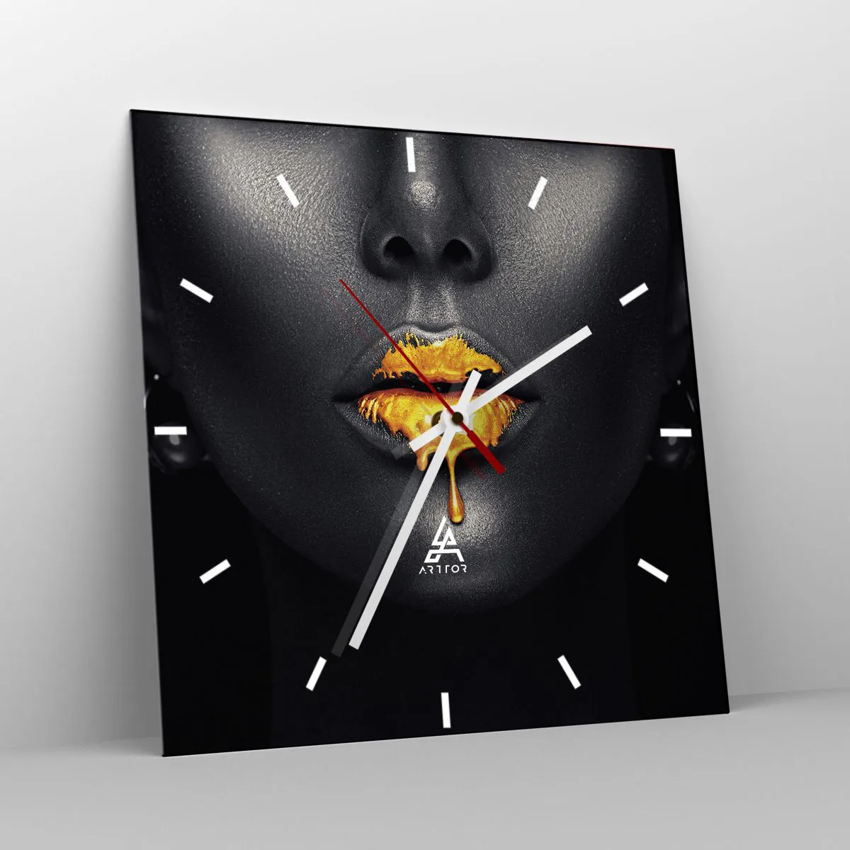 Wanduhr - Glasuhr - Schwarz-goldenes Porträt einer Frau mit einem Tropfen Gold auf den Lippen - 30x30cm - Goldmaul - Moderne Wanddekoration für Wohnzimmer und Schlafzimmer ARTTOR