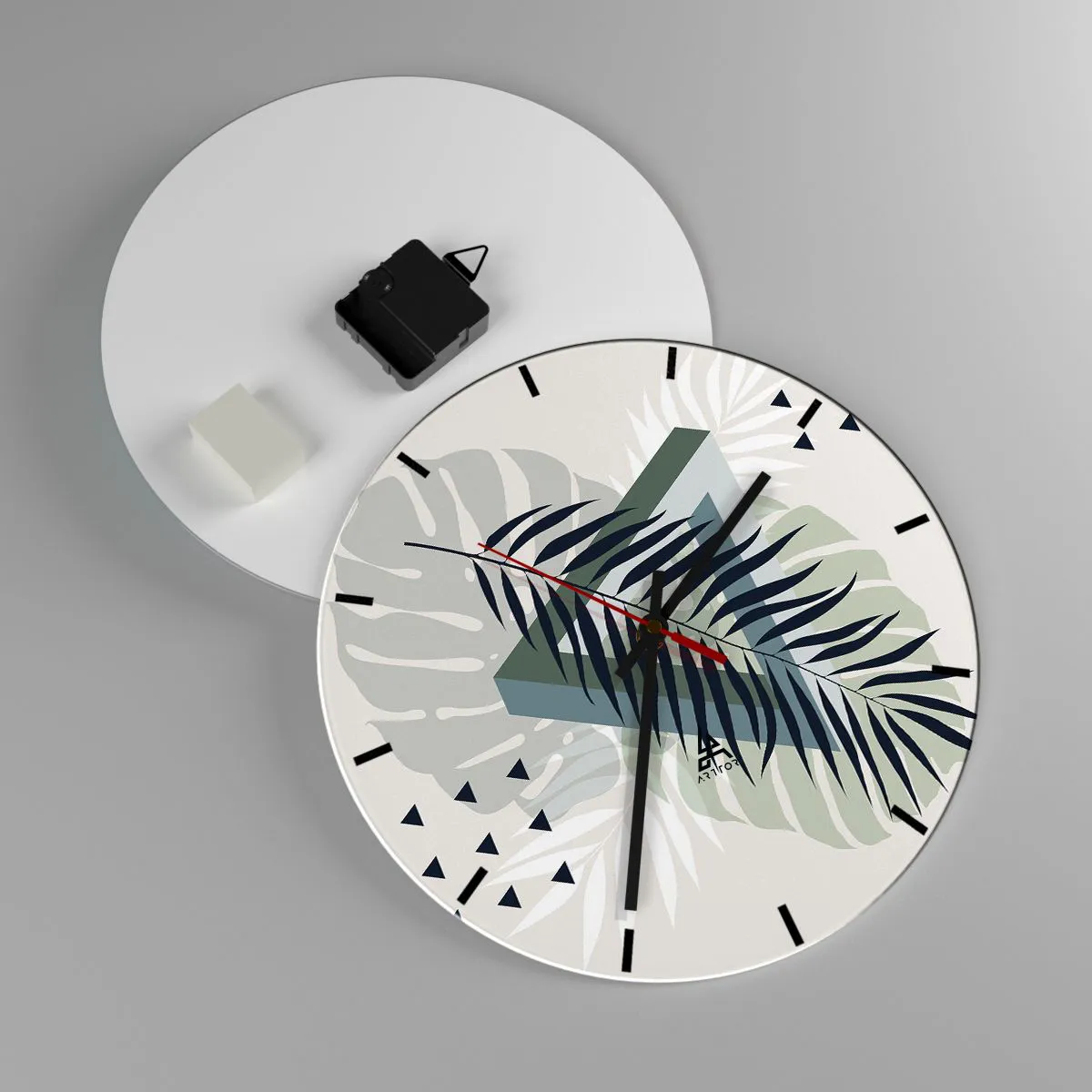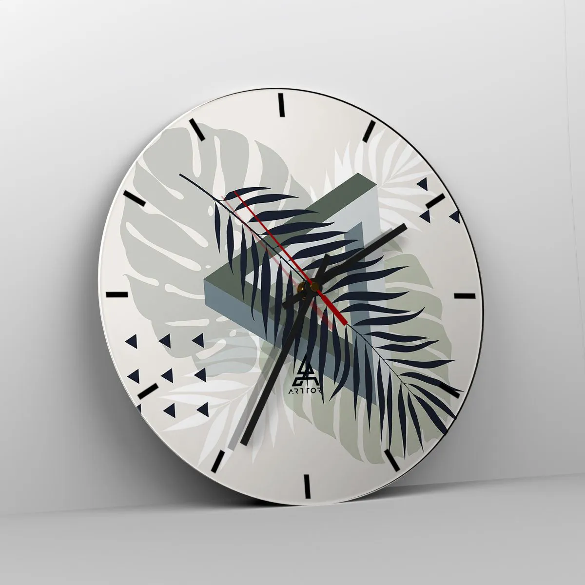 - Eine Wanduhr mit einer eleganten, geometrischen Komposition aus tropischen Blättern. Eine harmonische Mischung aus Natur und abstrakten Formen im modernen Stil.