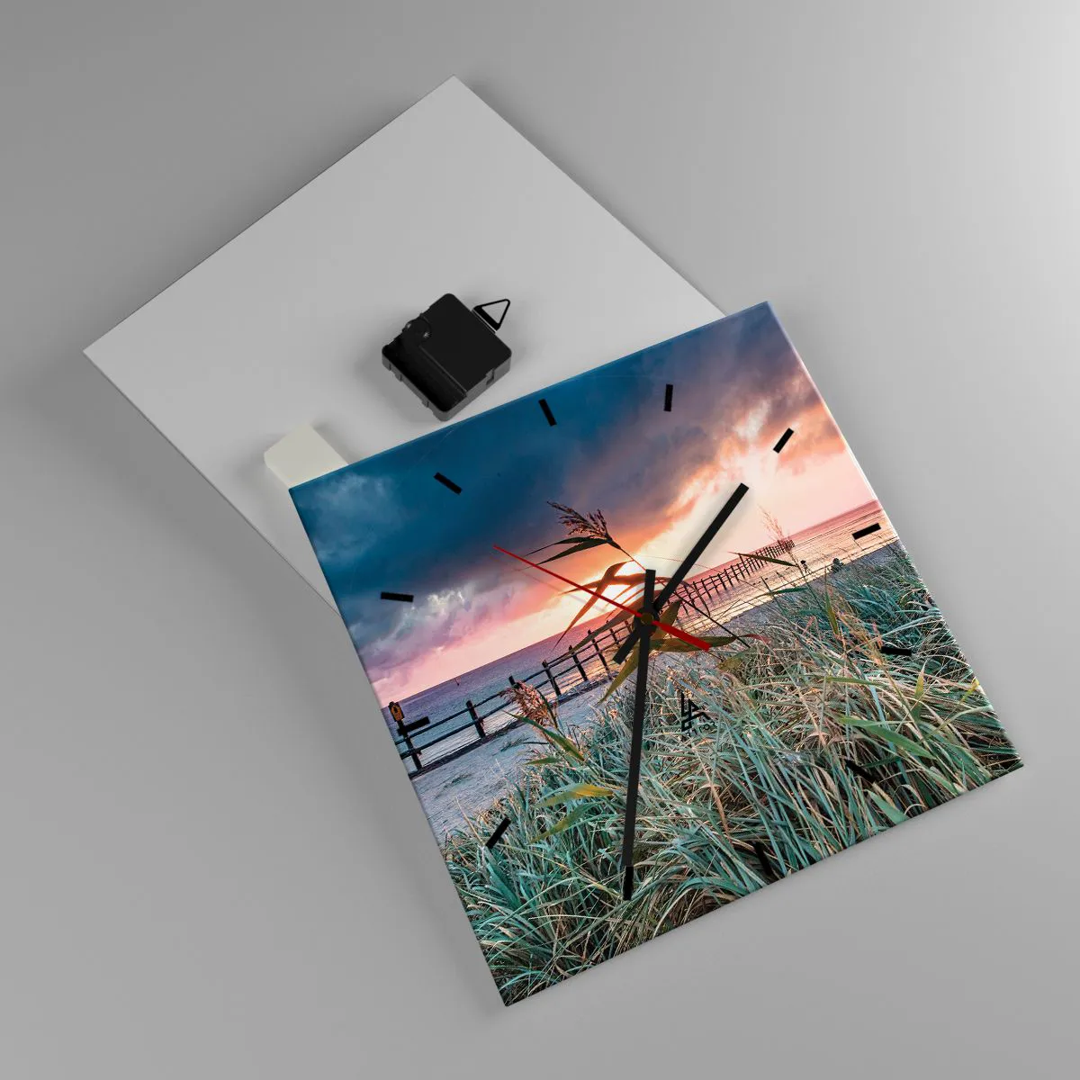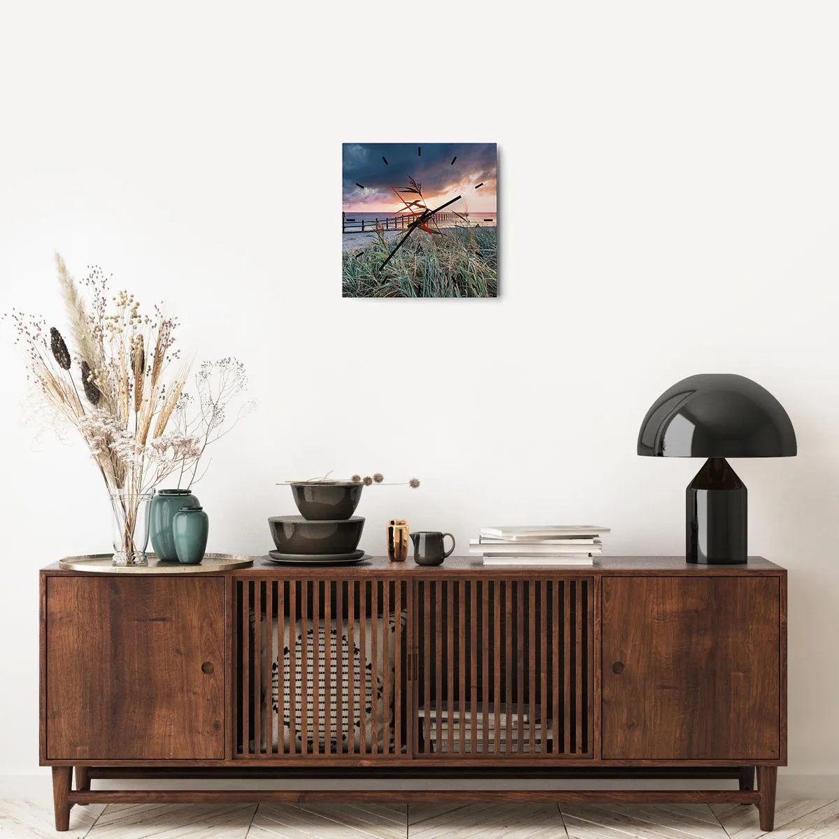 Wanduhr - Glasuhr - Strand bei Sonnenuntergang mit Gräsern im Vordergrund - 30x30cm - Es vergeht nicht mit dem Wind - Moderne Wanddekoration für Wohnzimmer und Schlafzimmer ARTTOR