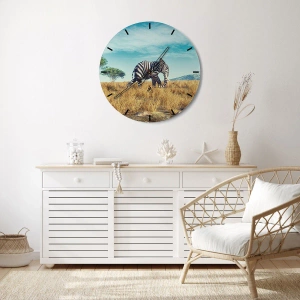 Die Glasuhr von ARTTOR hat einen Durchmesser von 30 x 30 cm. Die Glasoberfläche verleiht Eleganz und verstärkt die Farbsättigung. Dank des hochwertigen Drucks wirkt jedes Detail – von der Textur des Grases bis zu den Streifen auf dem Elefantenkörper – ausdrucksstark und langlebig.