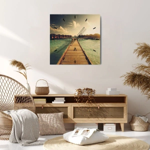 - Diese Wanduhr mit einem Durchmesser von 30 x 30 cm zeigt einen Blick auf einen Holzsteg, der bei Sonnenuntergang zu den Cottages am Wasser führt. Die stimmungsvolle Szene auf dem Glas verleiht dem Innenraum eine exotische Ruhe.