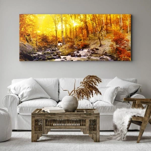 Bild auf Leinwand - Leinwandbild - Herbstwald mit einem Bach zwischen goldenen Blättern - 140x50cm - In Gold und Platin gefasste Steine - Moderne Wanddekoration für Wohnzimmer und Schlafzimmer ARTTOR