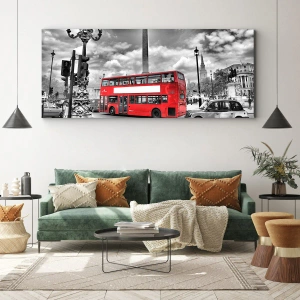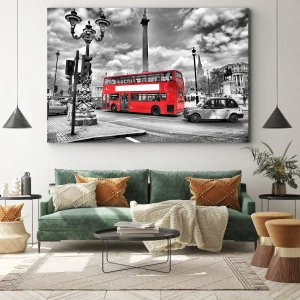 Bild auf Leinwand - Leinwandbild - Ein roter Doppeldeckerbus vor einer schwarz-weißen Stadtkulisse - 80x120cm - Der wahre Blutkreislauf der Stadt - Moderne Wanddekoration für Wohnzimmer und Schlafzimmer ARTTOR
