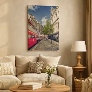 Bild auf Leinwand - Leinwandbild - Roter Doppeldeckerbus in London in der Nähe der Straße und der Kathedrale - 50x70cm - Londoner Straße in Grau und Rot - Moderne Wanddekoration für Wohnzimmer und Schlafzimmer ARTTOR