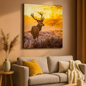 Bild auf Leinwand - Leinwandbild - Ein Hirsch vor dem Hintergrund eines herbstlichen Waldes, der von der goldenen Sonne beleuchtet wird - 80x120cm - König des Herbstwaldes - Moderne Wanddekoration für Wohnzimmer und Schlafzimmer ARTTOR