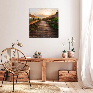 Bild auf Leinwand - Leinwandbild - Holzsteg zum Strand bei Sonnenuntergang - 70x100cm - Und direkt ans Ufer - Moderne Wanddekoration für Wohnzimmer und Schlafzimmer ARTTOR