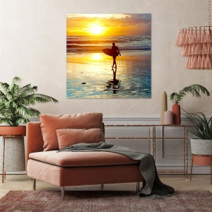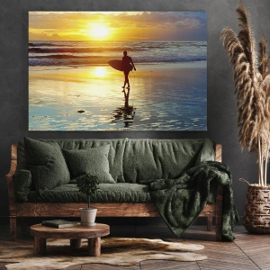 Bild auf Leinwand - Leinwandbild - Ein Surfer geht bei Sonnenuntergang mit einem Brett in der Hand am Strand spazieren. - 50x70cm - Die Rückkehr des Kriegers - Moderne Wanddekoration für Wohnzimmer und Schlafzimmer ARTTOR