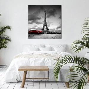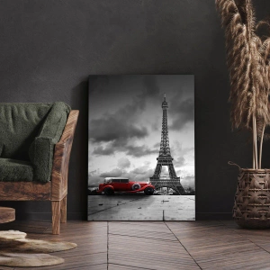 Bild auf Leinwand - Leinwandbild - Rotes Retro-Auto vor dem Eiffelturm in Schwarz und Weiß - 70x100cm - Vor nicht allzu langer Zeit in Paris - Moderne Wanddekoration für Wohnzimmer und Schlafzimmer ARTTOR