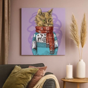 Bild auf Leinwand - Leinwandbild - Eine Katze in Pullover und Schal auf violettem Hintergrund - 50x70cm - Die Katze nicht nur in Schuhen - Moderne Wanddekoration für Wohnzimmer und Schlafzimmer ARTTOR