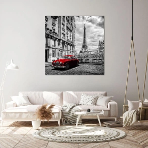 Bild auf Leinwand - Leinwandbild - Ein rotes Auto mit dem Eiffelturm im Hintergrund in einer schwarz-weißen Umgebung - 80x120cm - Raubtier in der Stadt - Moderne Wanddekoration für Wohnzimmer und Schlafzimmer ARTTOR