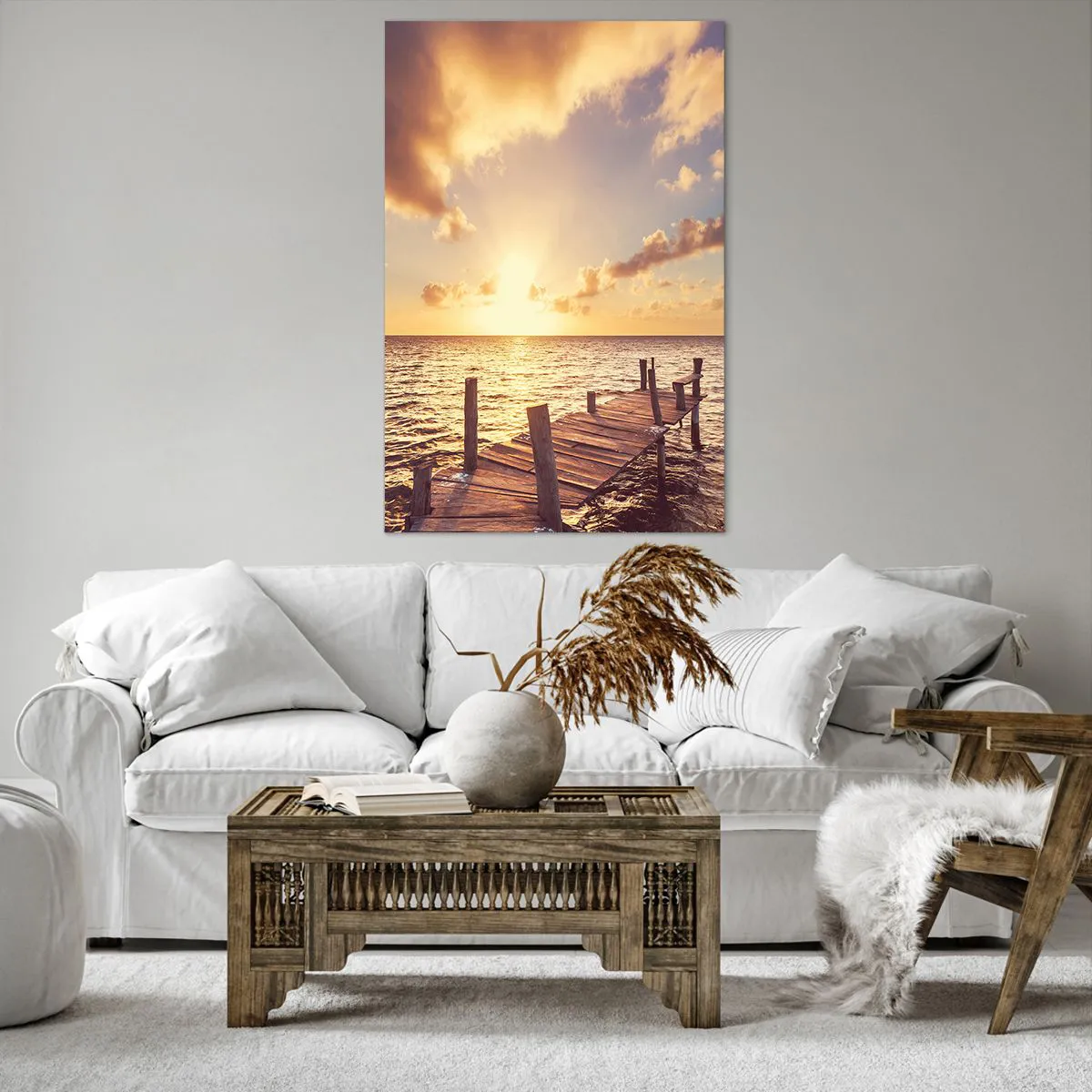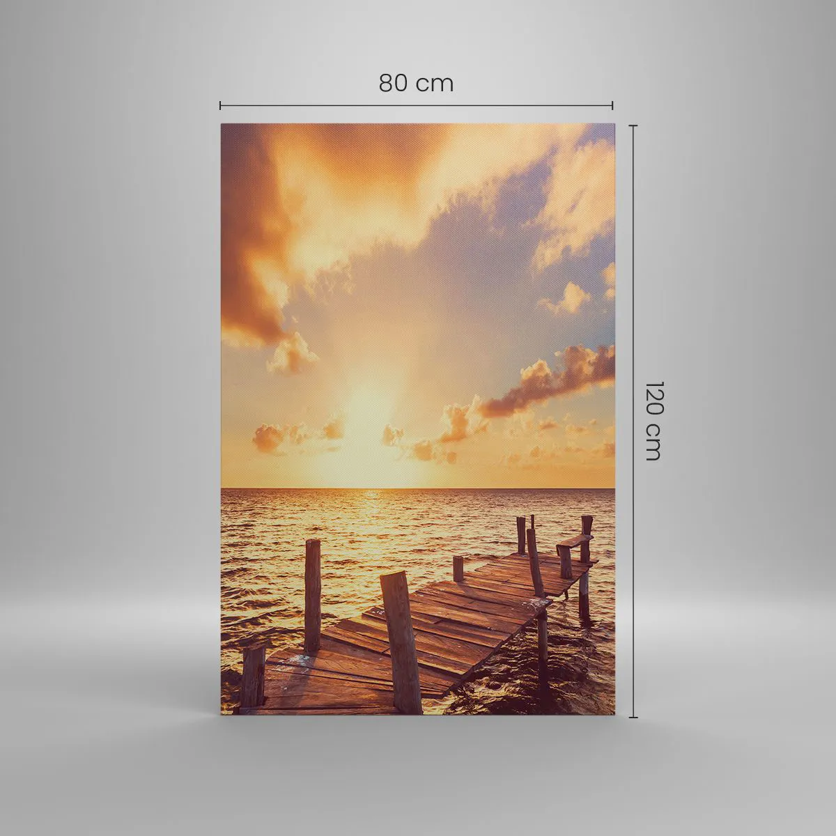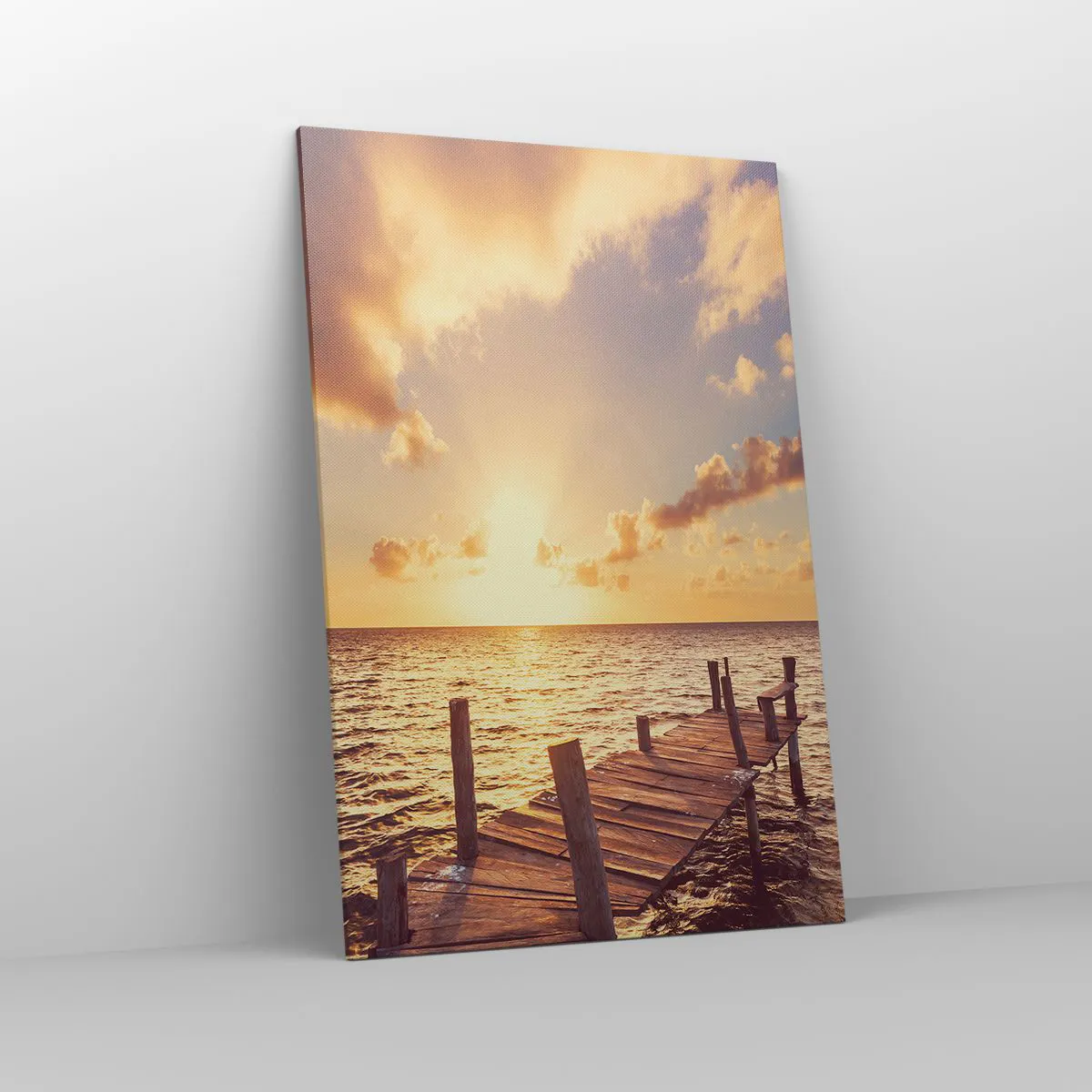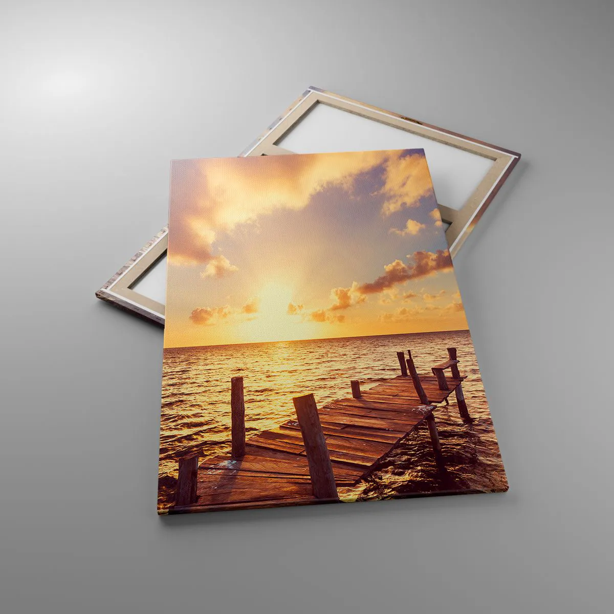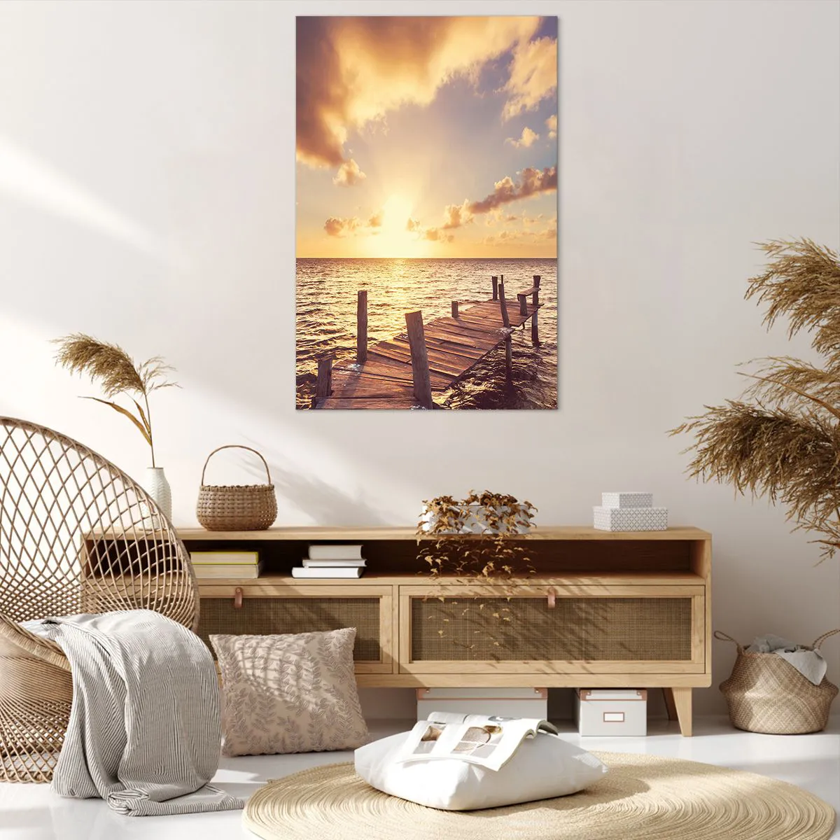 Bild auf Leinwand - Leinwandbild - Ein Holzsteg führt in Richtung Sonnenuntergang - 80x120cm - Das goldene Land der Sanftmut - Moderne Wanddekoration für Wohnzimmer und Schlafzimmer ARTTOR
