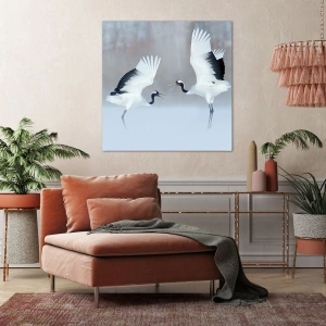 Bild auf Leinwand - Leinwandbild - Zwei Kraniche tanzen in einer nebligen Landschaft - 50x70cm - Tanz im Nebel - Moderne Wanddekoration für Wohnzimmer und Schlafzimmer ARTTOR
