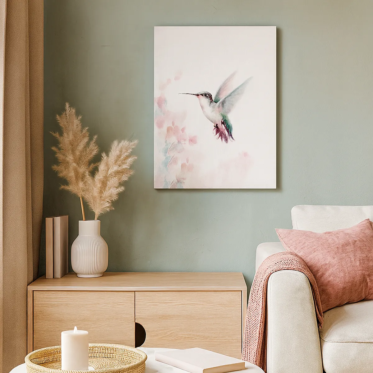 • Kolibri, Vogel, Kunst, Natur, Pastell, Tiere, Für das Büro, für das Arbeitszimmer, für das Esszimmer, für den Flur, für das Wohnzimmer, für das Schlafzimmer, Weiß, Rosa, Grau, Vertikal
