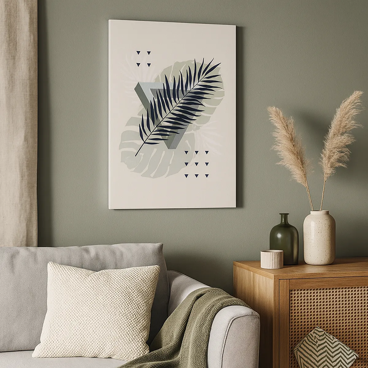 Bild auf Leinwand - Leinwandbild - Geometrische Komposition mit tropischen Blättern in Grüntönen - 80x120cm - Natur und Geometrie – zwei Ordnungen? - Moderne Wanddekoration für Wohnzimmer und Schlafzimmer ARTTOR
