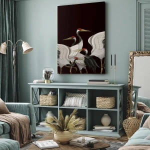 Bild auf Leinwand - Leinwandbild - Weiße Kraniche mit roten Akzenten auf schwarzem Hintergrund - 70x100cm - Vogelsachen - Moderne Wanddekoration für Wohnzimmer und Schlafzimmer ARTTOR