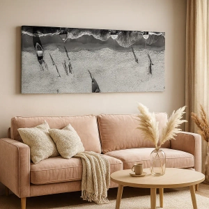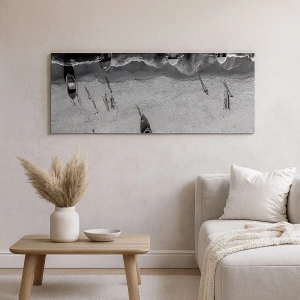 Bild auf Leinwand - Leinwandbild - Schwarz-Weiß-Luftaufnahme von Booten am Strand - 70x50cm - Immer noch am Ufer… - Moderne Wanddekoration für Wohnzimmer und Schlafzimmer ARTTOR