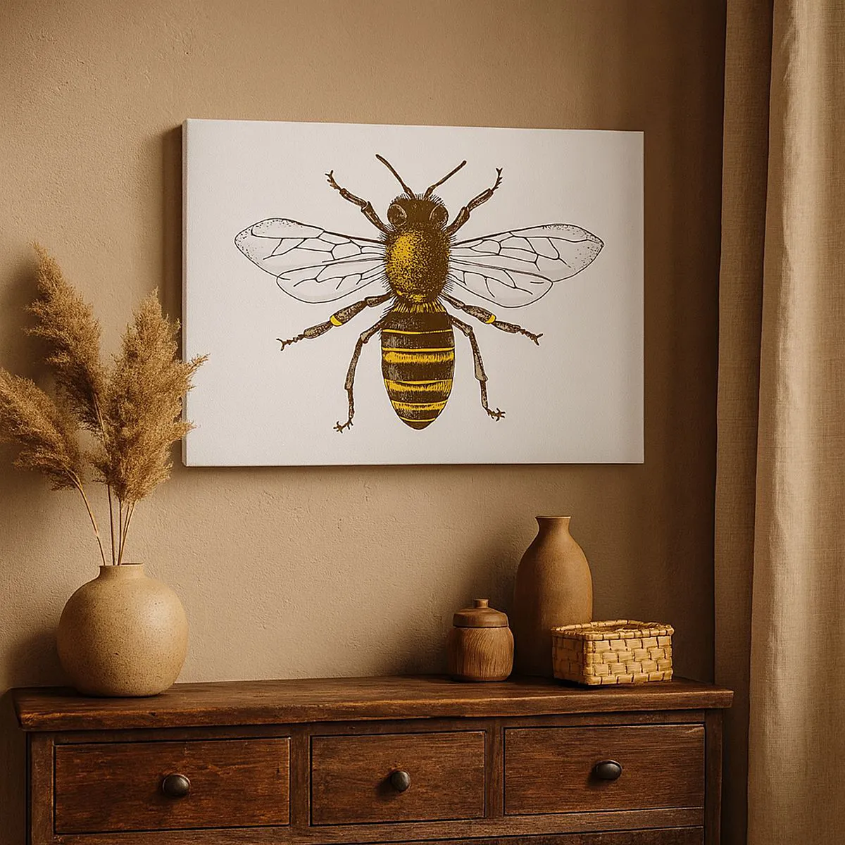 - Dieses Gemälde zeigt eine detailreiche Illustration einer Biene vor weißem Hintergrund. Ein stilvolles und subtiles Motiv, perfekt für harmonische Innenräume und Naturliebhaber.