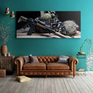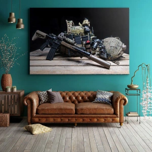 Dank des professionellen Leinwanddrucks besticht das Gemälde durch intensive Farben und präzise Details. „Taktische Ausrüstung mit einem Gewehr auf einem Holztisch“ ist die perfekte Wahl für alle, die einzigartige Dekorationen mit Bezug zu Militär und Sicherheit schätzen.