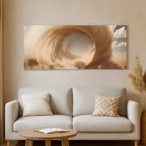 • Dieser Leinwanddruck zeigt einen dynamischen Sandwirbel in der Wüste, umgeben von einer goldenen Baumlandschaft. Perfekt für Innenräume mit modernem und exotischem Flair.