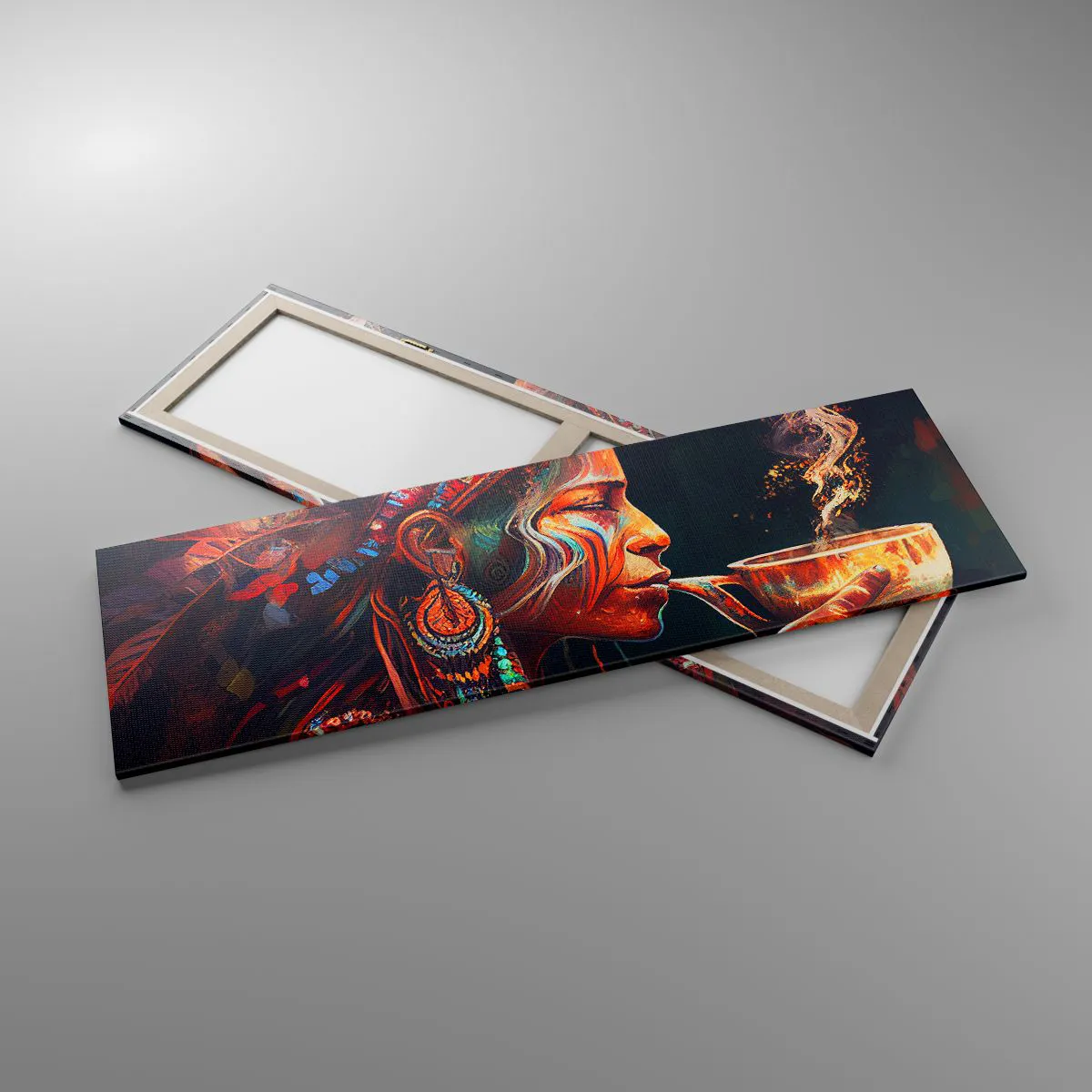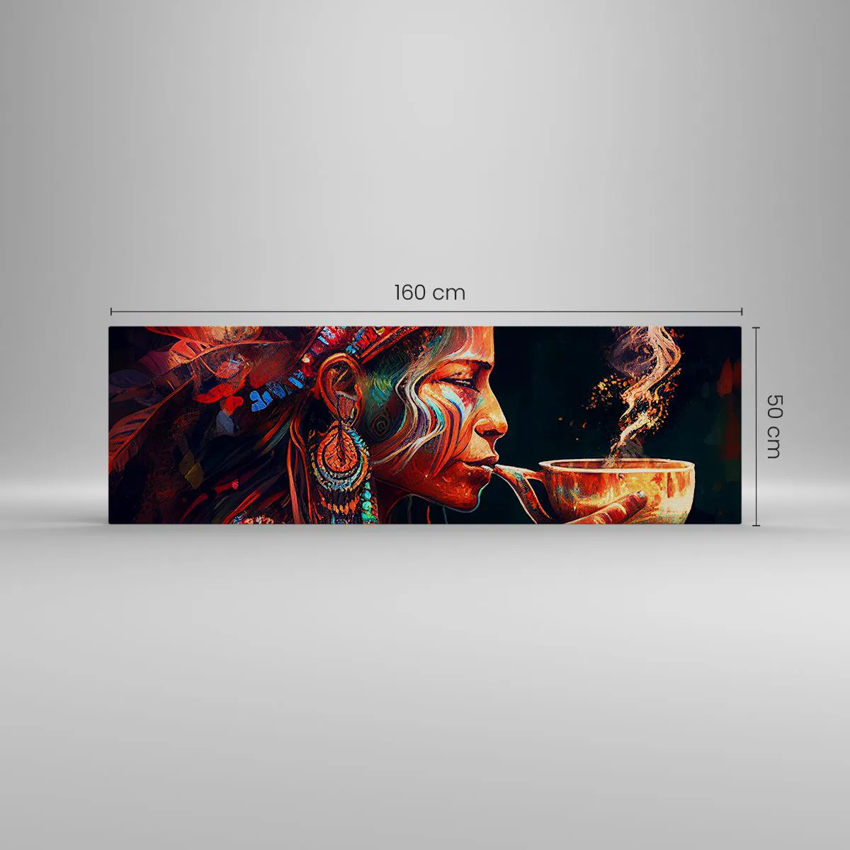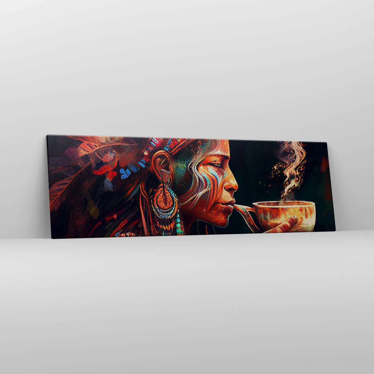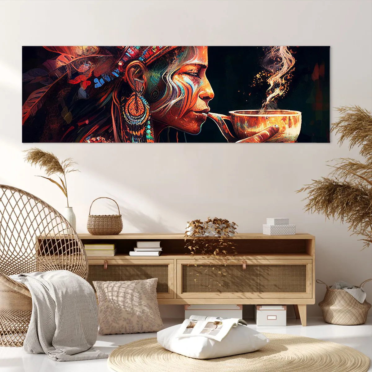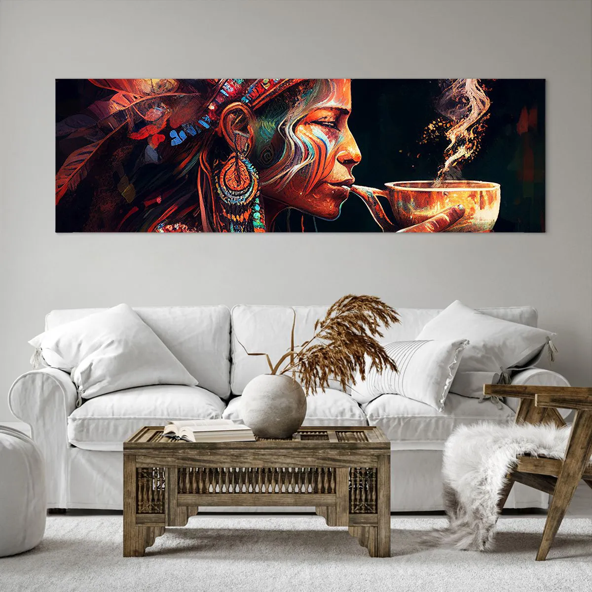 Bild auf Leinwand - Leinwandbild - Eine farbenfrohe Figur im Ethno-Stil mit einer Tasse dampfenden Getränks - 160x50cm - Magisches Ritual - Moderne Wanddekoration für Wohnzimmer und Schlafzimmer ARTTOR