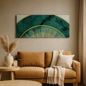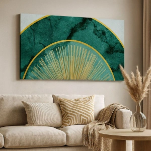 - Ein Leinwanddruck mit einem abstrakten Muster aus smaragdgrünen und goldenen Kreisen, perfekt für moderne Innenräume, die elegante Akzente benötigen.