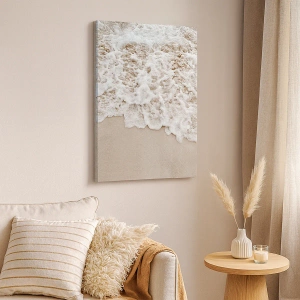 Die Leinwand wird über den Rahmen gespannt. Die Seiten und Kanten werden gedruckt, um das Bild fortzusetzen. Das Bild ist fertig zum Aufhängen an der Wand. Jedes Produkt hat einen am Rahmen befestigten Anhänger und ein Montageset (Schraube + Stift).