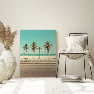 Das Gemälde strahlt Harmonie und Ruhe aus und vermittelt die entspannte Atmosphäre eines tropischen Resorts. Die geordnete Reihe der Palmen sorgt für Rhythmus und Symmetrie, während das zarte Licht und die Farben eine sommerliche Atmosphäre vermitteln. Die Komposition lädt zum Entspannen, zu Spaziergängen entlang der Küste und zum Bewundern des Charmes der Küstenlandschaft ein. Dies ist die perfekte Dekoration für Innenräume, die unbeschwerte Momente und positive Emotionen hervorrufen sollen.