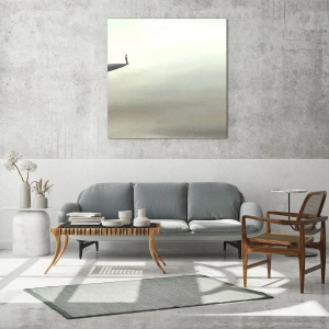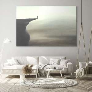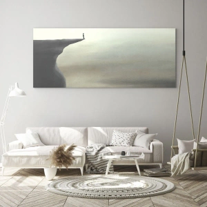 Glasbild - Bild auf glas - Silhouette einer Figur am Rand einer Klippe in einer nebligen Landschaft - 80x120cm - Nach oben, natürlich! - Moderne Wanddekoration für Wohnzimmer und Schlafzimmer ARTTOR